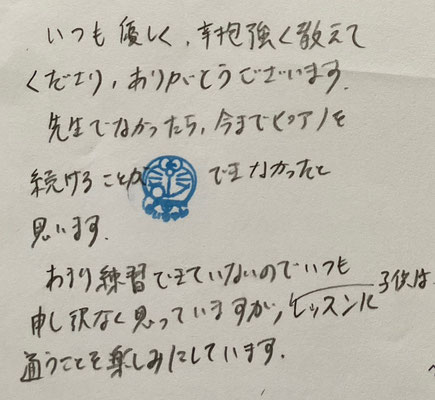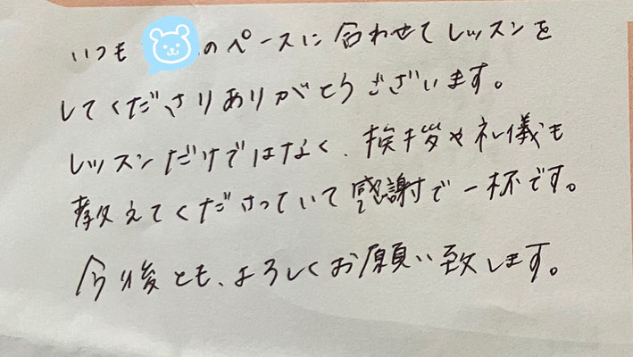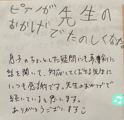 ♪ピアノの練習に対して少し抵抗があった息子を本人のペースで自ら練習するように導いてくださっていることに感謝とともに、両親や祖父母以外に息子の成長を喜んでくださる方の存在もありがたく思っています。
