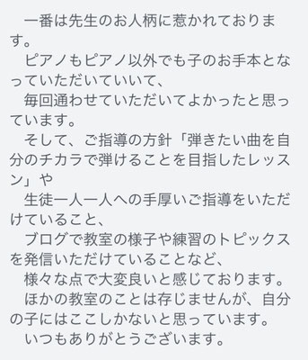 その中でも基本的なことをしっかり学べるその子どもに沿った曲選びをされていることがひとつ、そして大事なポイント、子どもが先生に親しみを持ちレッスンを楽しめていたことが1番の理由ではあります。